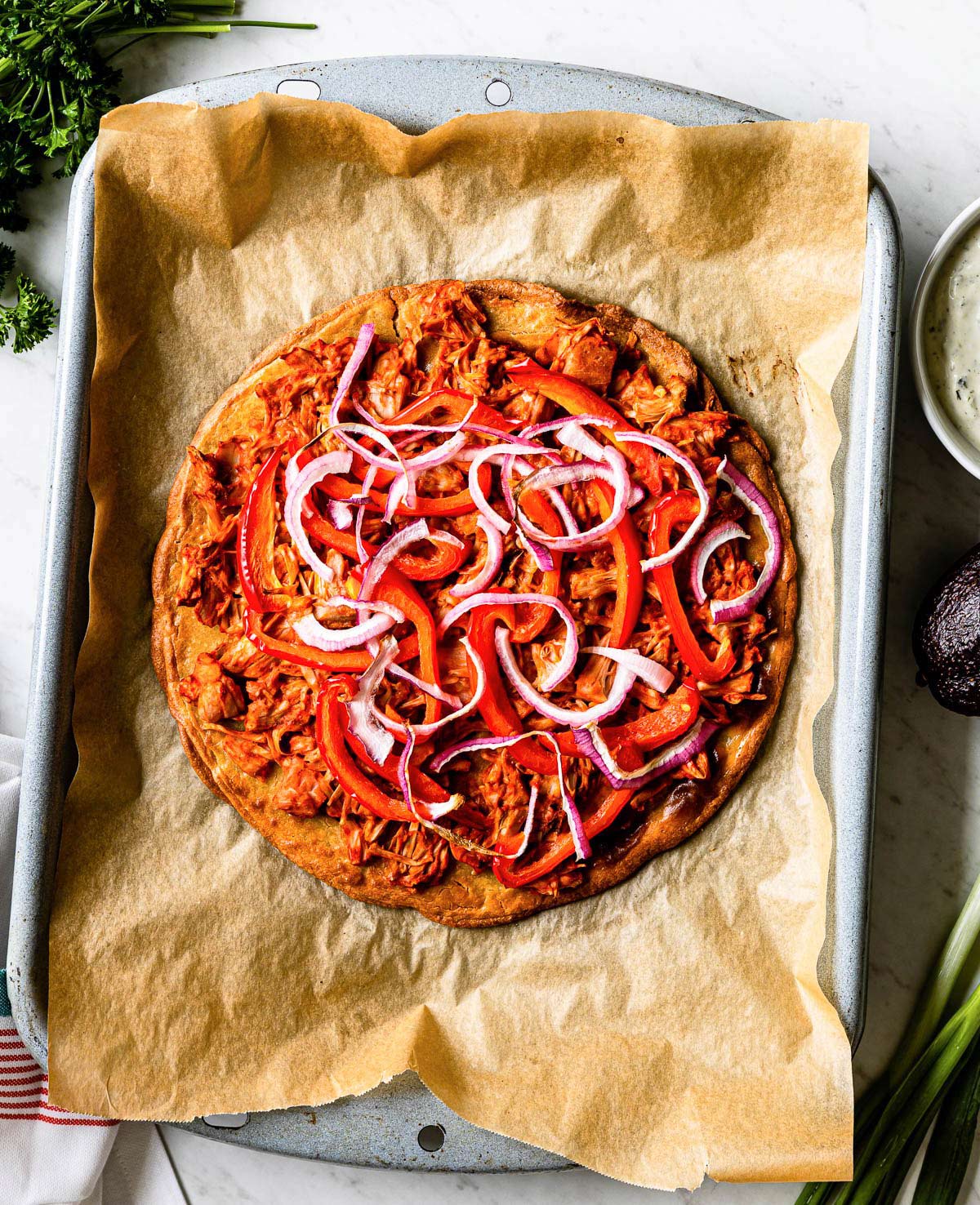 - To assemble the pizza, place the prepared crust on the lined baking sheet and top with the jackfruit mixture. Add the purple onion and bell pepper then bake for 10-15 minutes or until the crust is golden and the veggies are tender.