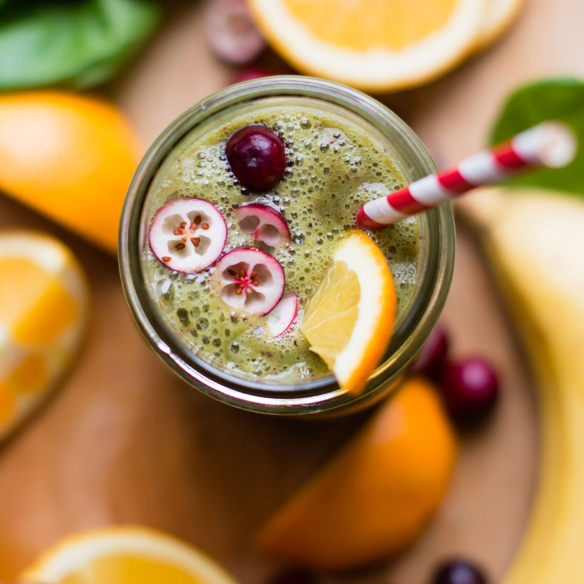 Fresh or frozen cranberries both work fine in this recipe. If you use frozen cranberries, then they will help chill your smoothie. And freezing doesn’t greatly affect the nutrient content of the fruit, though fresh will give you the most nutrients.