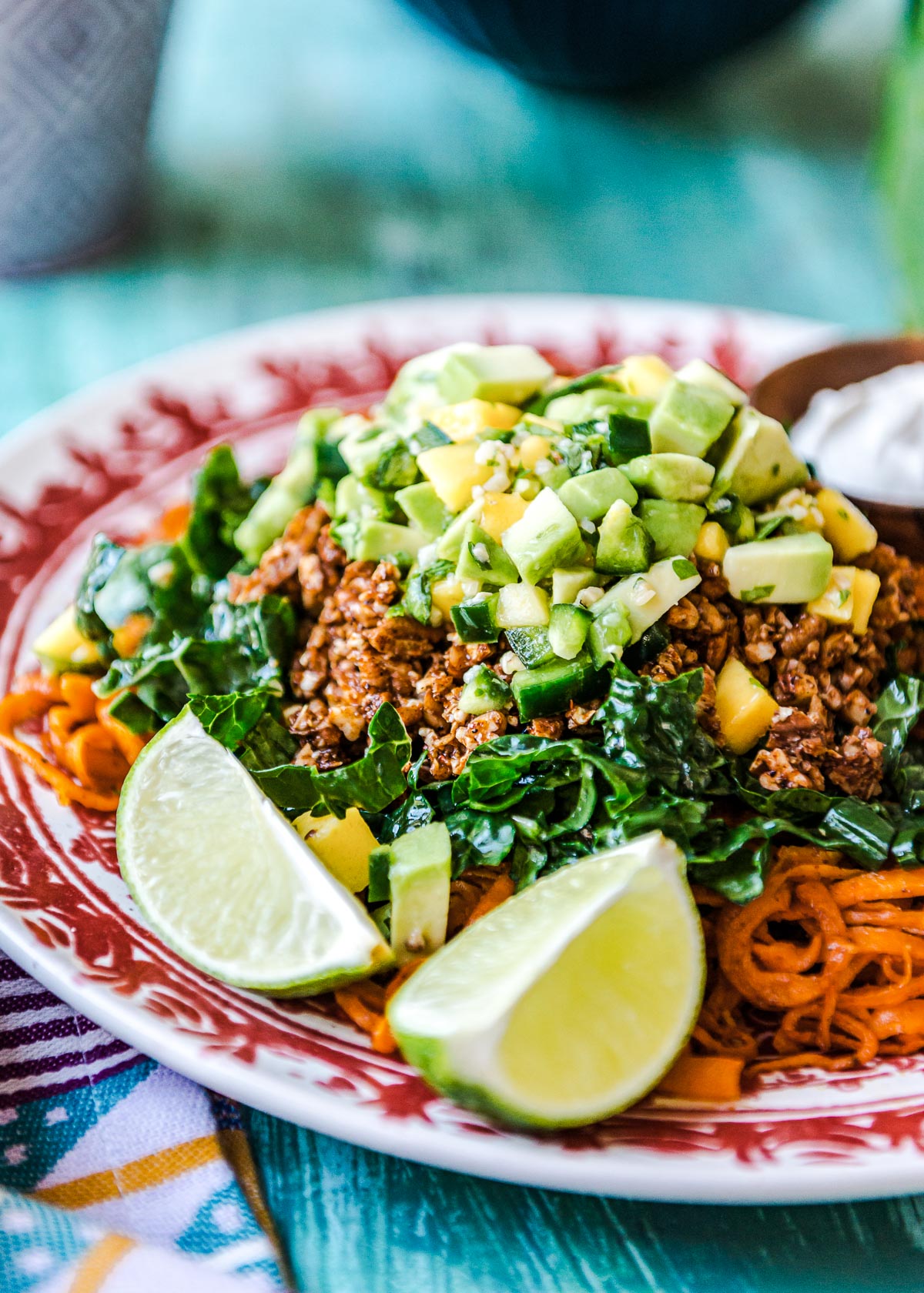 - Serve: To serve, place the baked swoodles on a plate. Top with the walnut “meat,” kale ribbons, avo pico de gallo, cilantro, and some cashew cream, if desired. Serve with lime wedge(s) on the side.