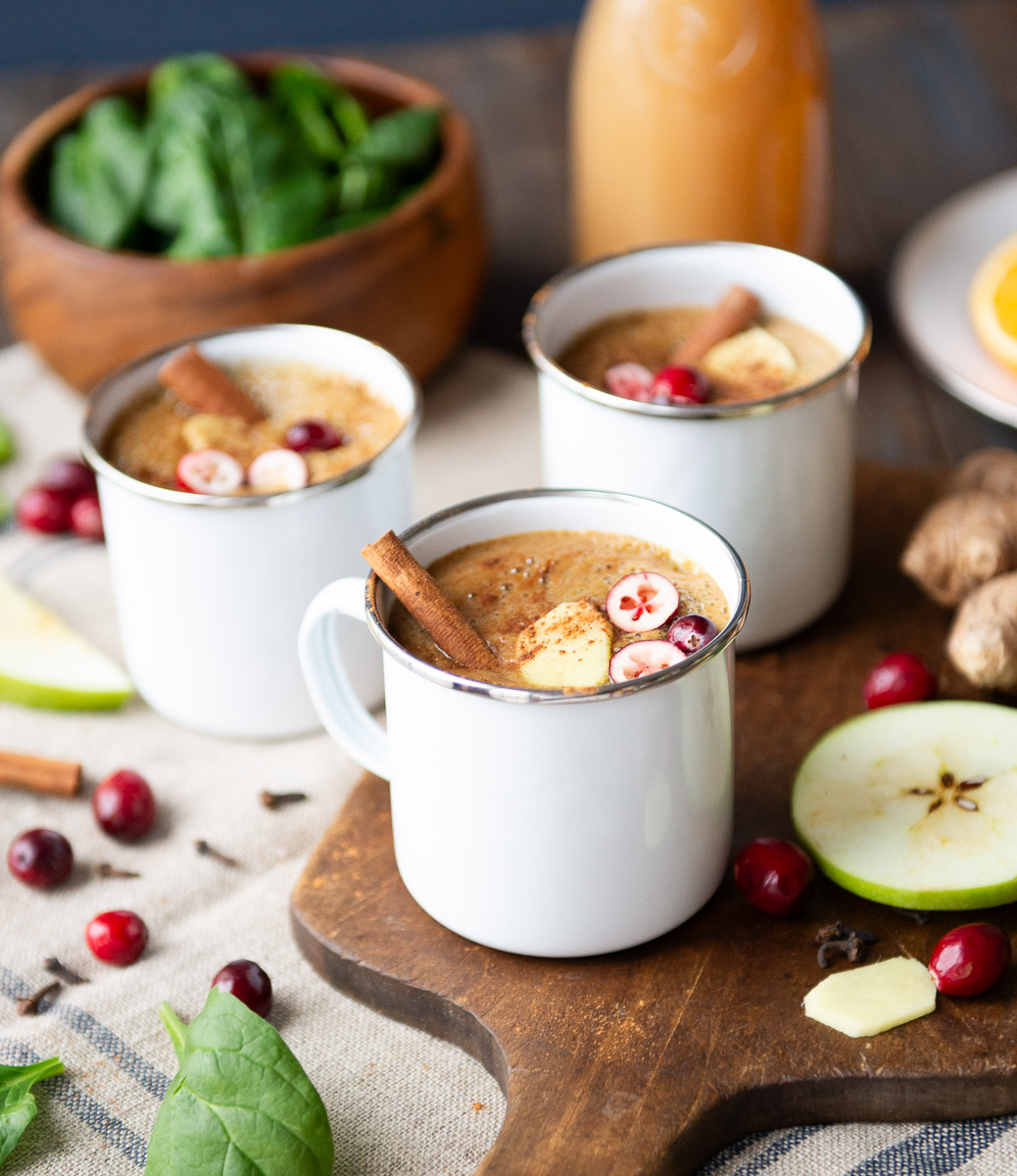 Wassail practically screams cozy holidays—warm mugs, citrusy spice, and that comforting apple-cider aroma filling the kitchen. But traditional wassail drink is mostly juice, which means it’s missing fiber and can lead to a quick blood sugar spike. This blended warm smoothie version keeps all the flavors we love while adding whole fruit for vital fiber, helping your body slow things down, feel more satisfied, and truly enjoy every festive sip.